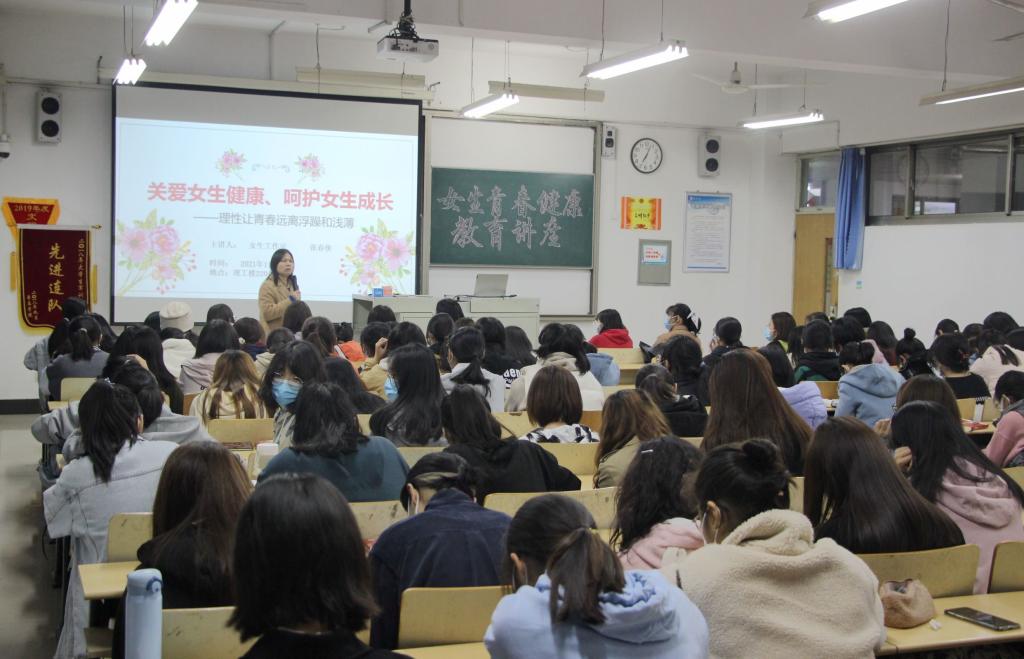 为进一步提高高校在校女生对青春期知识的了解,解决成长中的困惑,增强自我防范、自我保护的意识,帮助女生树立“自尊、自强、自爱、自立”的理念,11月5日,beat365英国官方网站在理工楼2204教室举办“女生青春健康教育”讲座。讲座由呵护女生教育工作组的张春侠老师主讲。学院2021级全体女生参会学习。