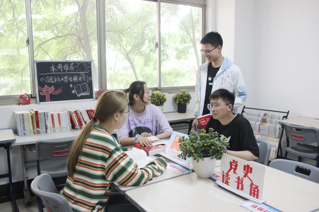 红色读书角区域内营造了浓厚的学习氛围,整齐摆放着《习近平与大学生朋友们》、《习近平的七年知青岁月》《苦难的辉煌》、《信仰的力量》、《顶天立地谈信仰》、《红色影像》等文献资料、组织建设、党史学习等多方面的读物,共计100余册。读书角由党员先锋队进行管理维护,每天轮流值日打扫整理书架,每周进行读书推荐,每月开展一次读书交流。