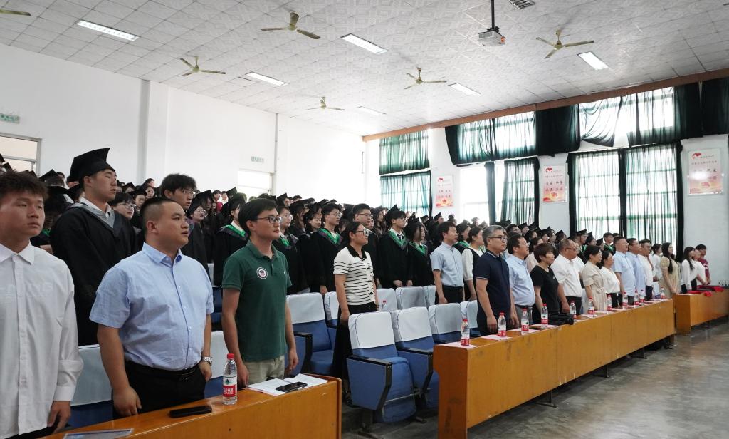 典礼仪式在雄壮的国歌声中拉开帷幕。副院长陈青宣读《关于授予2024届beat365英国官方网站本科毕业生学士学位的决定》。随后,获得学士学位的同学们在庄严的音乐声中走上主席台,校党委委员、统战部部长林勇依次为他们拨穗正冠、颁发学士学位证书、赠送学院实验田里的小麦花束并合影留念。