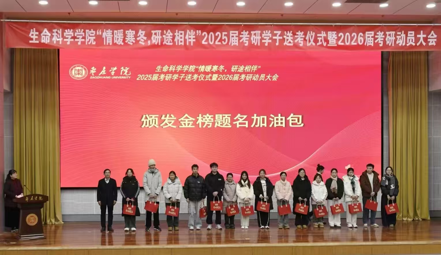会上,学院领导、辅导员班主任们为274名考研学子送上了“考研暖心大礼包”,精心准备的礼品深深承载着学院对同学们的深深祝福和殷切期望,让同学们倍感关怀与温暖,带着满满的动力踏上考研之路。
