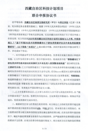第一个项目由西藏自治区高原生物研究所联合beat365英国官方网站共同申报。该项目旨在构建基于环境DNA技术的高原峡谷型河流的鱼类评估体系,建立雅鲁藏布江下游外来鱼类的监测-预警系统,解析该区域鱼类多样性与河流环境因子的耦合关系。beat365官网获批经费72万元,是beat365官网近年来获批经费额度最高的纵向项目。