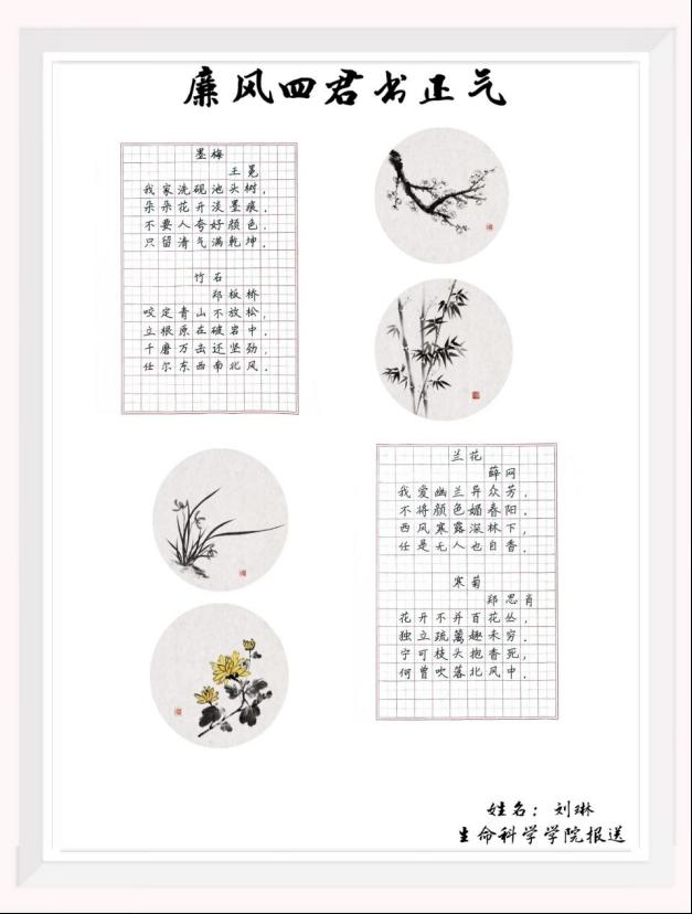 教师刘琳的书法作品《廉风四君书正气》脱颖而出,荣获书法类二等奖。她以笔为剑、以墨为锋,将“梅兰竹菊”四君子高洁品性与廉洁精神巧妙融合,笔锋刚劲洒脱、气韵生动,尽显传统书法艺术魅力与廉洁文化深厚底蕴。