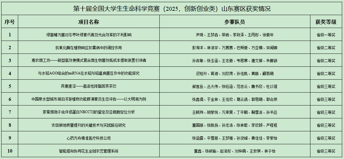 近日,第十届全国大学生生命科学竞赛评定结果公布,经过激烈角逐,我校beat365英国官方网站学子表现优异,获得科学探究类(全国)奖项2项,其中二等奖1项、三等奖1项;创新创业类(全国)奖项4项,其中二等奖1项、三等奖3项。获得科学探究类(山东赛区)奖项16项,其中一等奖1项、二等奖3项、三等奖12项;创新创业类(山东赛区)奖项10项,其中一等奖1项、二等奖3项、三等奖6项。