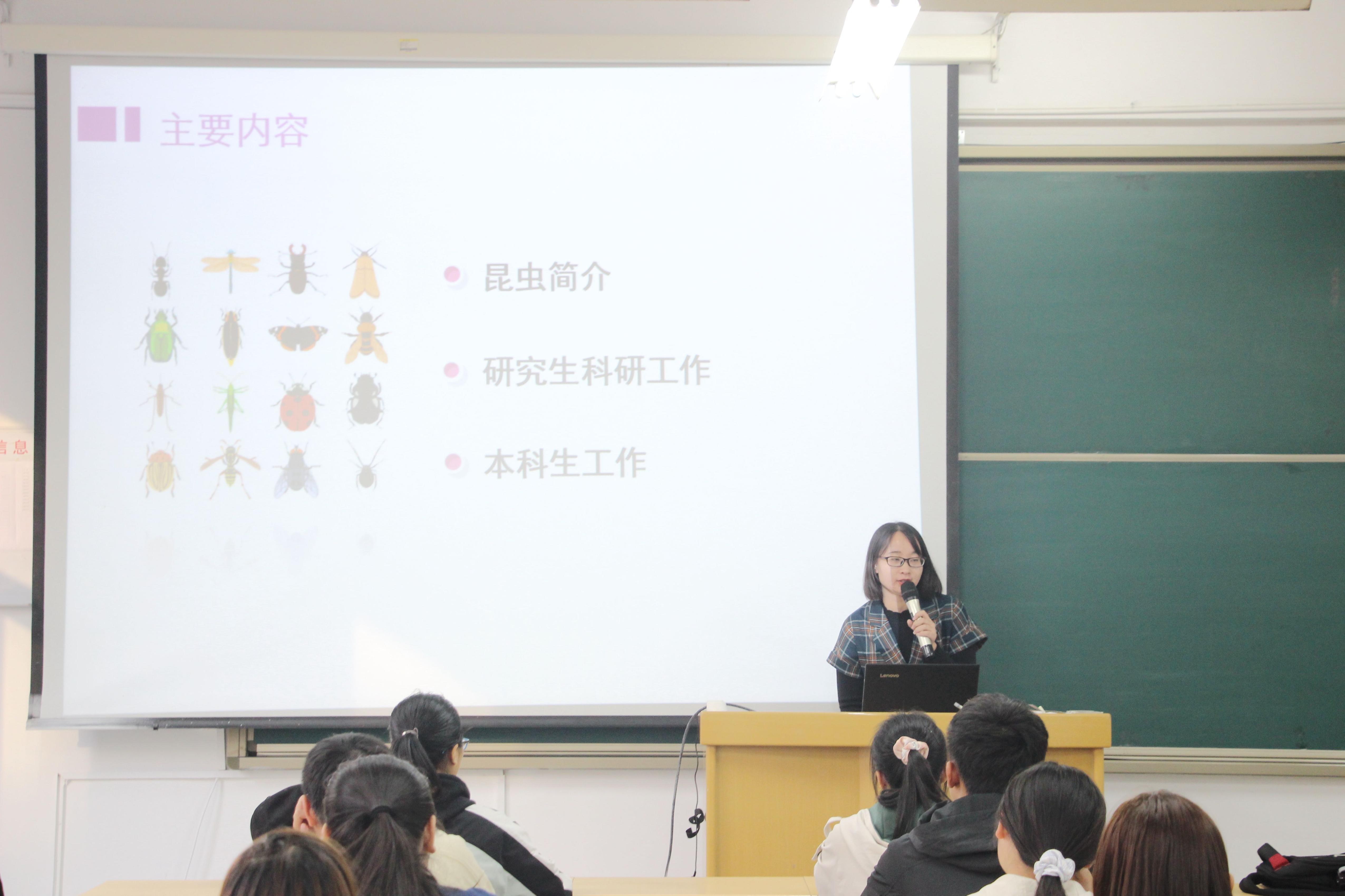 报告会主题为《奇妙的昆虫世界》。袁娟娟以生动形象的语言就昆虫简介、研究生科研工作及本科生工作三个方面内容进行详细讲解。报告会中,袁娟娟从多个角度全面阐述昆虫学的研究方向、发展前景及实用价值,并以自己在南开大学的亲身经历为学生今后的考研深造以及本科生在科研工作方面的要求提出了具体指导。