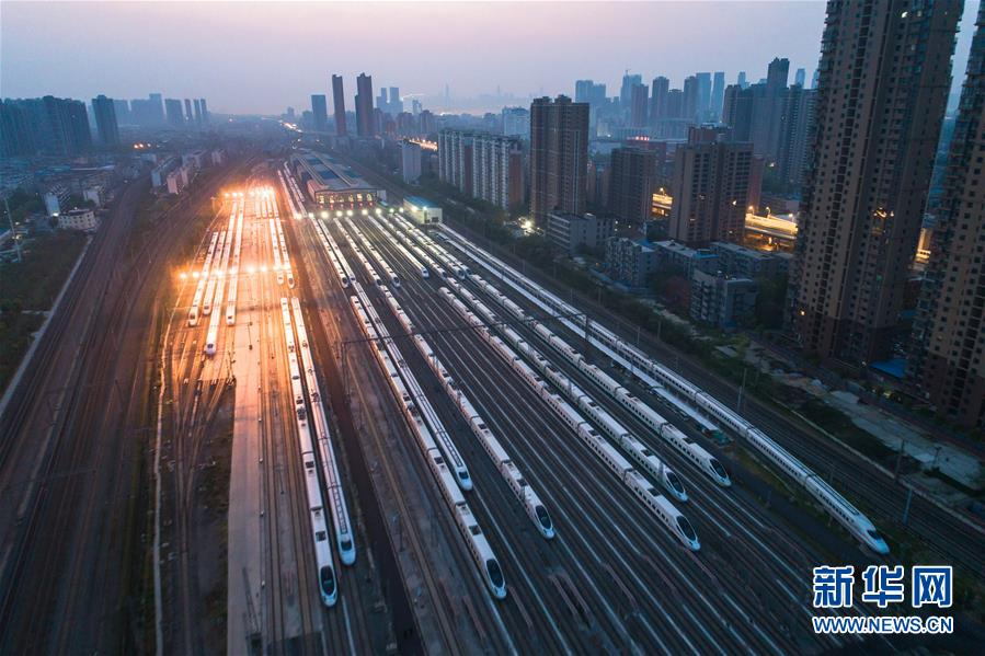4月8日,在武汉动车段,列车停靠在存车线上准备投入运行(无人机照片)。新华社记者 肖艺九 摄