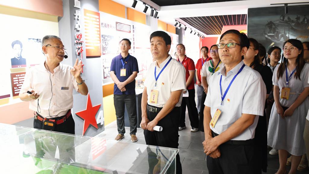 在周营镇白楼湾运河支队记忆馆,师生们先后学习“运河两岸燃烽火、星火照白楼、经典战役永流传、秘密通道送领导、统一战线放光芒五个单元”的内容。在资深讲解员声情并茂的描述中,党员们仿佛回到了革命先烈浴血杀敌、忠贞报国的峥嵘岁月,深刻感悟了“敢于斗争、乐于奉献、舍生取义、艰苦奋斗”的运河支队精神。
