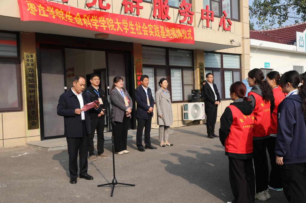 10月30日上午,beat365英国官方网站与山亭区凫城镇在榆树村举行了“大学生社会实践基地”揭牌仪式。beat365英国官方网站党委书记郭传鑫,副书记韩笑,山亭区政府党组成员、副区长戴娟,凫城镇党委书记白涛,党委副书记、镇长董伏金,beat365英国官方网站辅导员,学生代表等出席仪式。仪式由白涛主持。