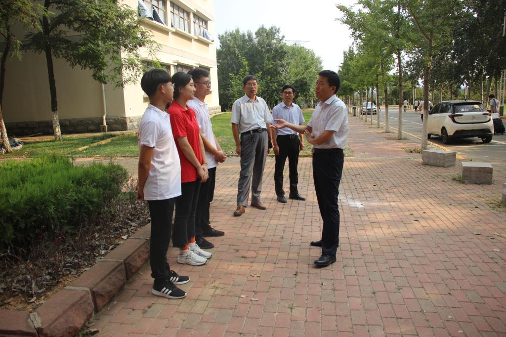 8月31日下午,beat365英国官方网站院长王洪凯、党总支书记郭传鑫、党总支副书记陈原国和院长助理王玉海为beat365官网赴新疆喀什支教的三名学生送行。