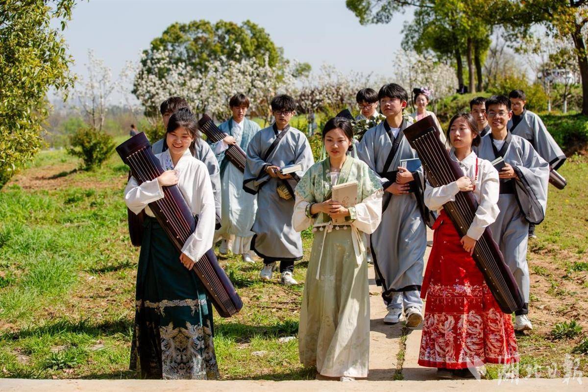 花海间三棵老树下,一少年弹奏着古琴,一少年吹箫,亭亭玉立,安静闲适。不远处,有人在书写琴谱,有人在研究围棋,有人在画画。再远处,来自武汉体育学院的少年们,身着统一、大气的武术服,正在演练太极以及健身气功八段锦、大舞。在东湖花间田野之中,亦静亦动,松紧有度,和谐天成。