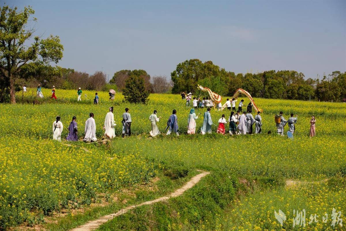 放眼望去,远处一群穿着汉服、舞服、武术服的少男少女们,背着古琴、茶具、笔墨纸砚,举着小巧的鱼龙、霸气的长金龙,有说有笑,缓缓走过太渔桥,走过长长的廊桥,到达百亩油菜花海。