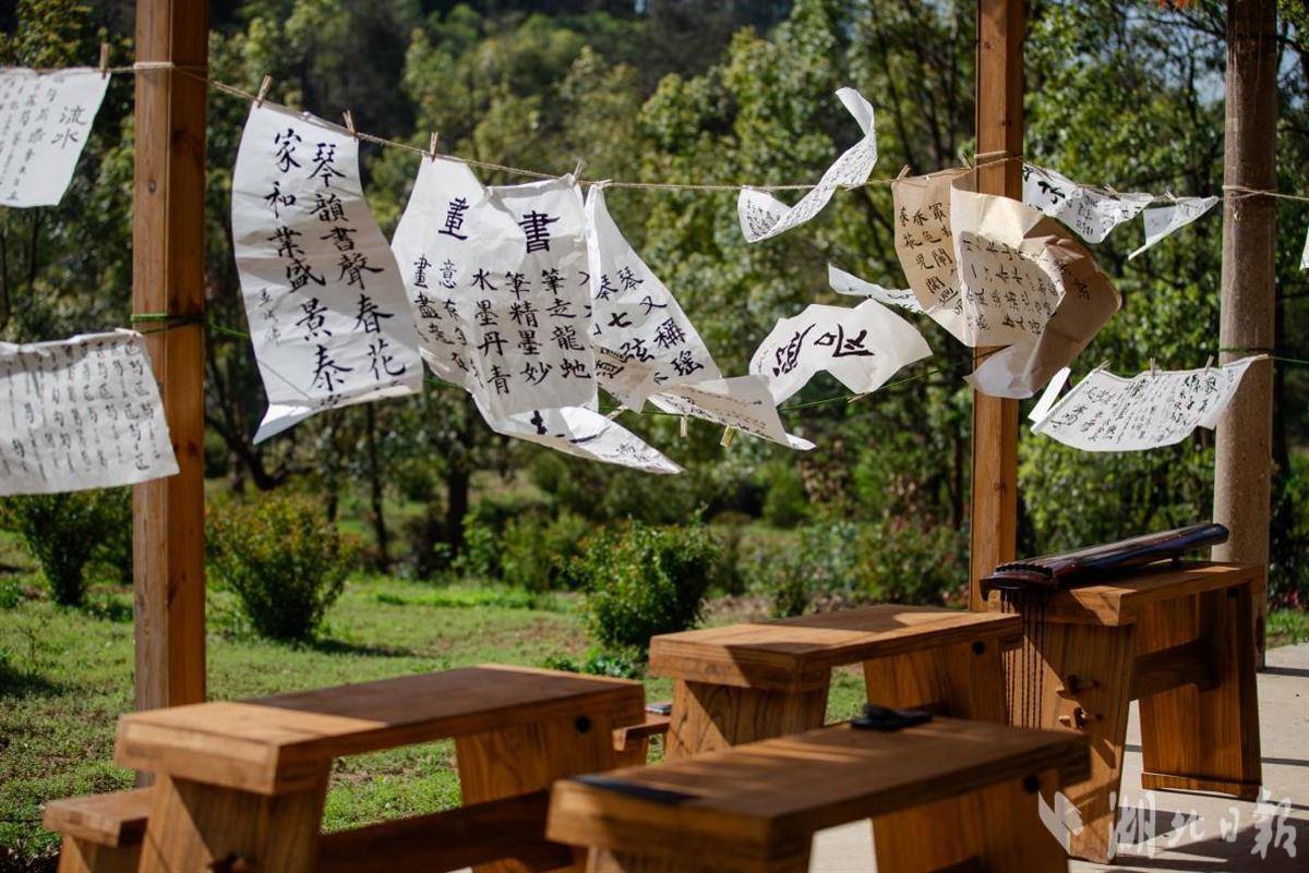 在不远处茅屋下,有几个衣着古代书生装的少男、少女,在桌上铺着笔墨纸砚,一笔一划,控笔运腕,学习中国书法。旁边的绳子上,晾着多副已经刚写好的书法作品,有小篆、行书、楷书等,引来游客们观赏和赞叹。
