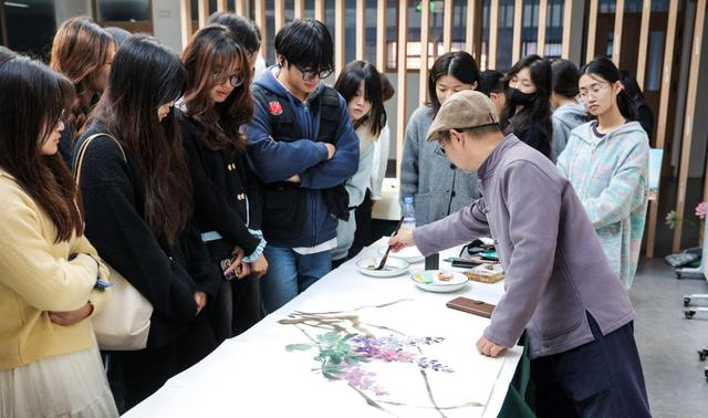 国画与书法展区则尽显静谧雅致,师生们屏息观赏,墨色在宣纸上流转晕染,山水花鸟栩栩如生。湖北省政协书画院院务委员、湖北省墨香荆楚书画院副院长童军民起笔作画,水墨画中的紫藤花栩栩如生。一撇一捺间刚劲风骨尽显,篆隶楷行各有韵味。湖北省硬笔书法协会柳长忠老师现场挥毫,写下“文华学圃知理修义,枫叶菁莪启智明仁”16字赠言,笔墨苍劲有力、气韵生动,引得学子们驻足品读、拍照留念。